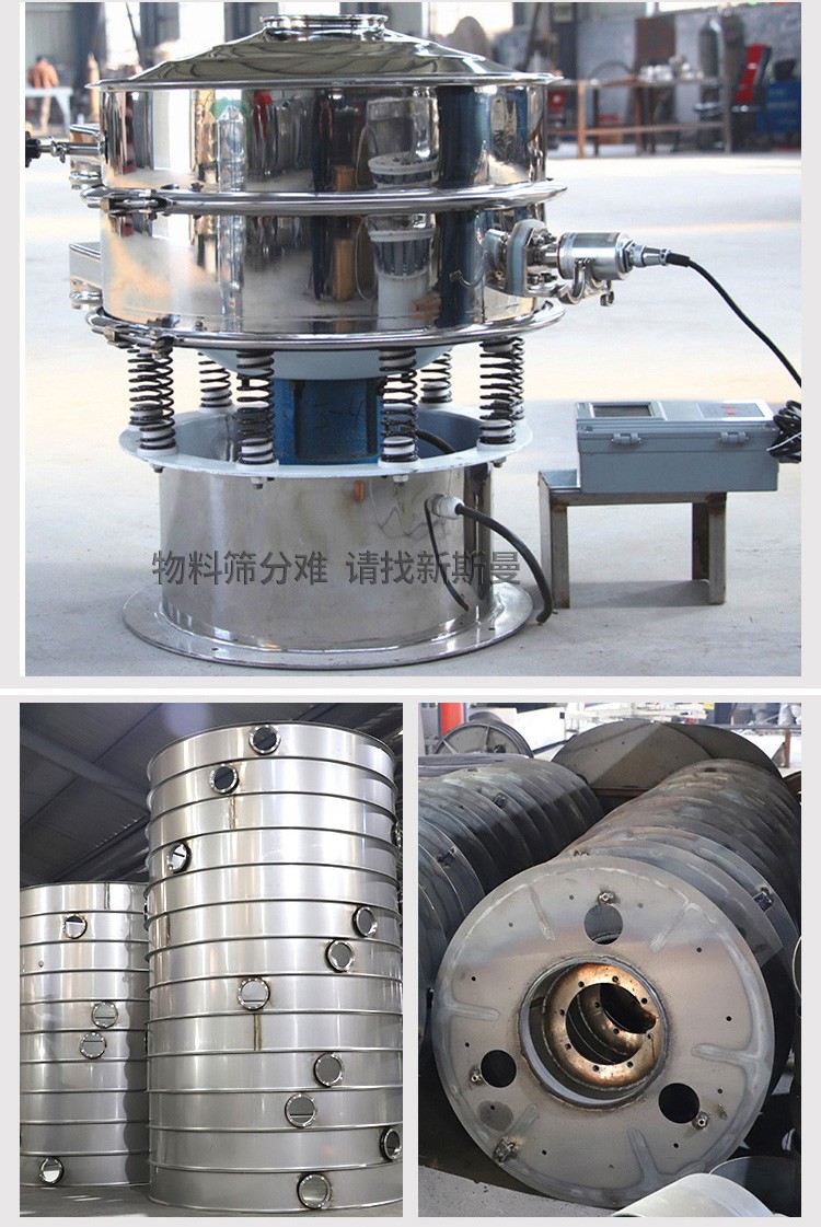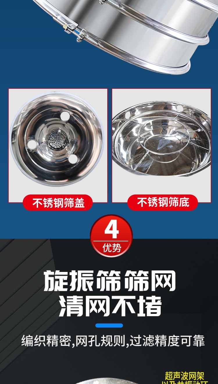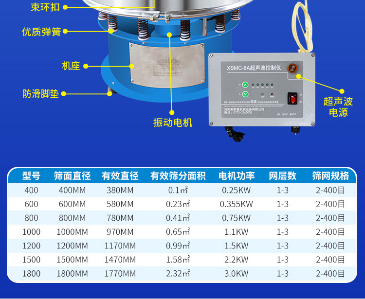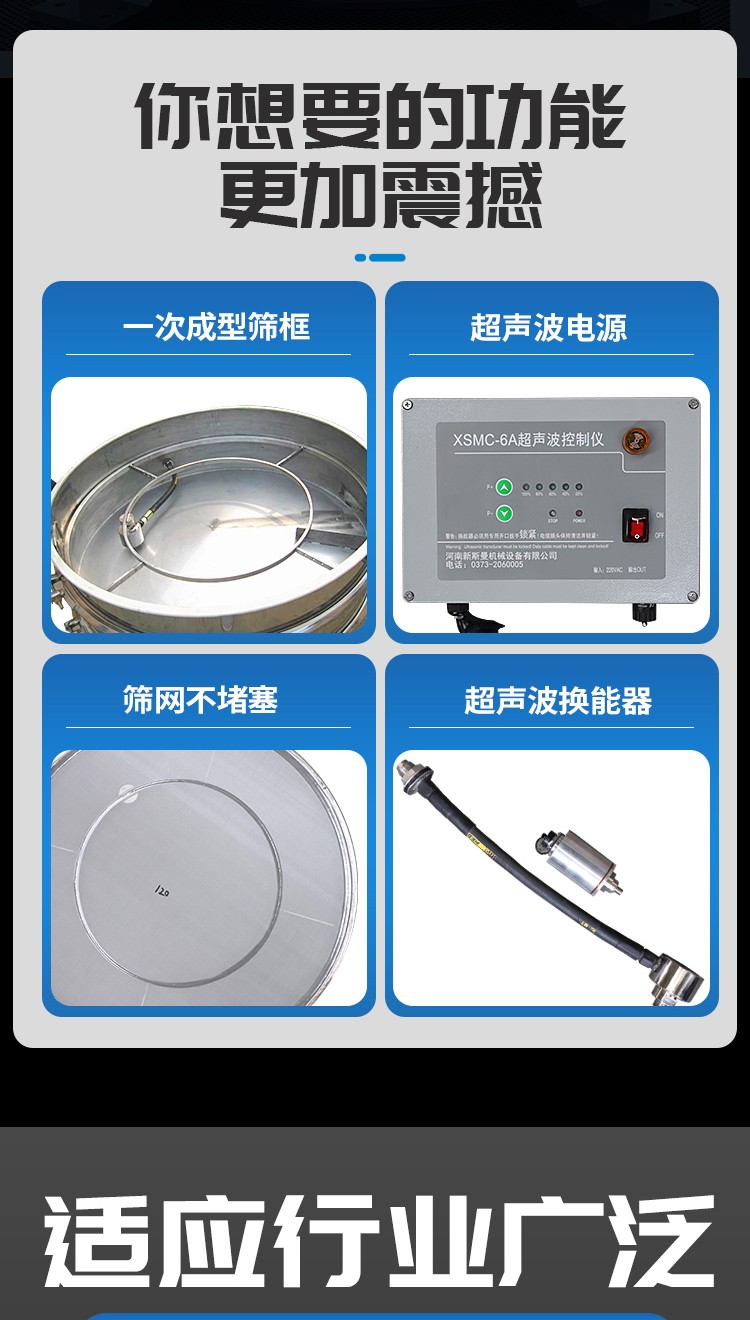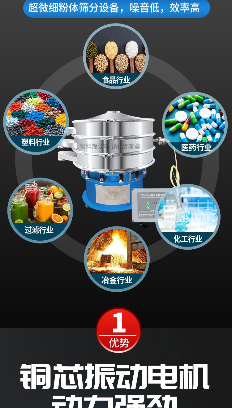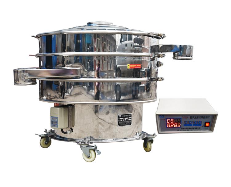 超聲波振動(dòng)篩是將220V、50Hz或110V、60Hz電能轉(zhuǎn)化為36KHz的高頻電能,輸入超聲換能器,將其變成36KHz機(jī)械振動(dòng),產(chǎn)生的功率超聲波使篩網(wǎng)作高頻振動(dòng)。篩網(wǎng)上的物料在作低頻旋振運(yùn)動(dòng)的同時(shí),疊加上超聲振動(dòng),既可防止網(wǎng)孔堵塞,又可使篩分機(jī)提高產(chǎn)量和質(zhì)量,從而達(dá)到快速篩分和清網(wǎng)的目的,使超微細(xì)粉篩分成為易事。該系統(tǒng)在傳統(tǒng)的振動(dòng)篩基礎(chǔ)上在篩網(wǎng)上引入一個(gè)低振幅、高頻率的超聲振動(dòng)波(機(jī)械波),以改變超微細(xì)分體的篩分性能。特別適合高附加值精細(xì)分體的用戶使用。