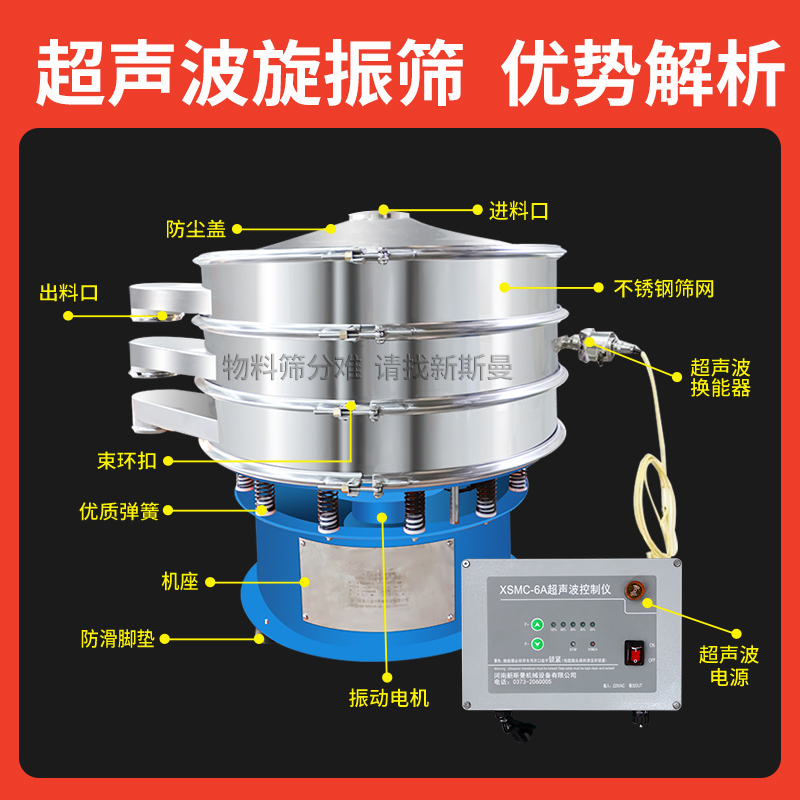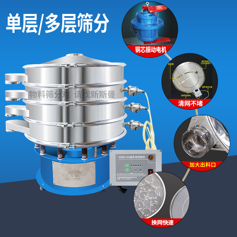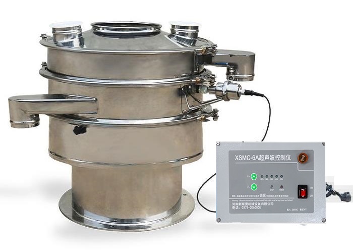 超聲波振動篩是在旋振篩的基礎上引入了超聲波清網(wǎng)裝置,通過將220V、50Hz或110V、60Hz電能轉化為18KHz的高頻電能,輸入超聲換能器,將其變成18KHz機械振動,從而達到高篩分和迅速清網(wǎng)的目的,使超微細粉篩分成為易事。該系統(tǒng)在傳統(tǒng)的振動篩基礎上在篩網(wǎng)上引入一個低振幅、高頻率的超聲振動波(機械波),以改善超微細粉體的篩分性能。特別適合高附加值精細粉體的用戶使用。超聲波篩分系統(tǒng)是一種簡單實用、可靠的篩分系統(tǒng),是當前網(wǎng)孔堵塞的有效的解決方法??蓮V泛應用于制藥、冶金、化工、選礦、食品等要求精細篩分過濾的行業(yè),篩分過濾精度高,有效解決因團聚、靜電、強吸附性卡堵網(wǎng)孔等篩分難題,是國內(nèi)篩分行業(yè)的一項重大技術突破。