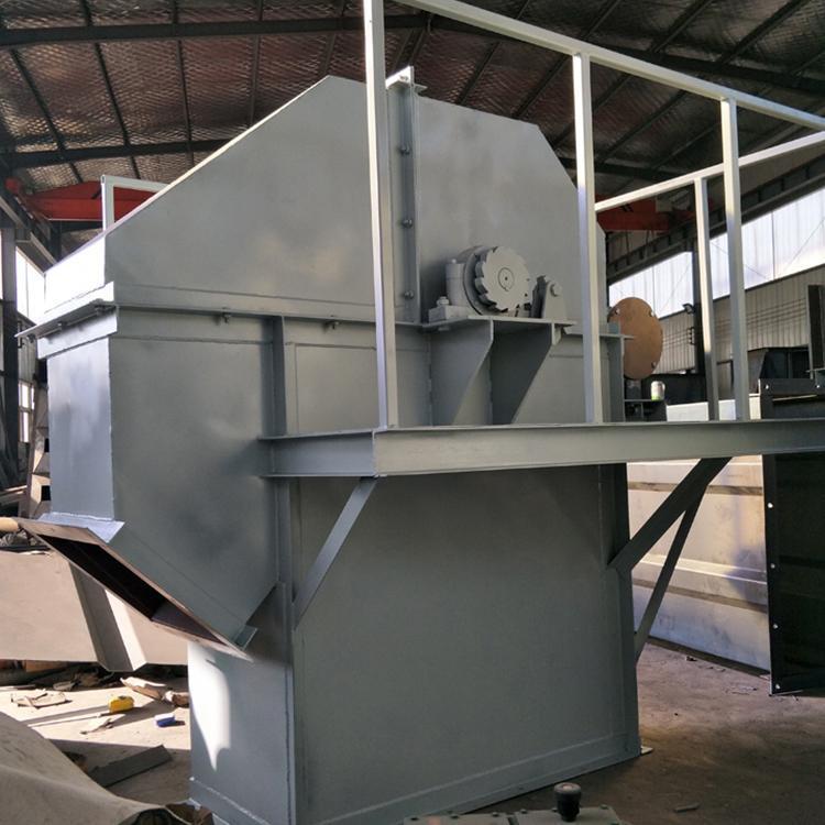 1、上部裝置:安裝有軌道(雙排道),防止鏈條擺動,逆止器,防止料斗回轉(zhuǎn),物料阻滿下部機殼,卸料口裝有橡膠板防止回料。