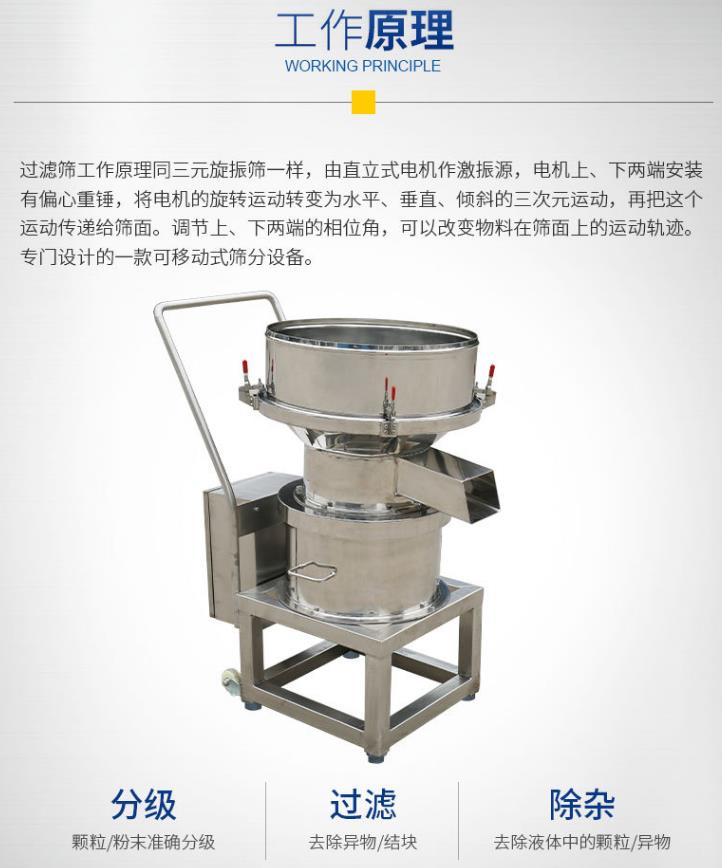 適用于各行業(yè)生產(chǎn)廠家單層篩分和過濾用,處理生產(chǎn)量不多或雜質(zhì)少的物料,例如:大顆粒含量的粉末篩分與漿液過濾;
