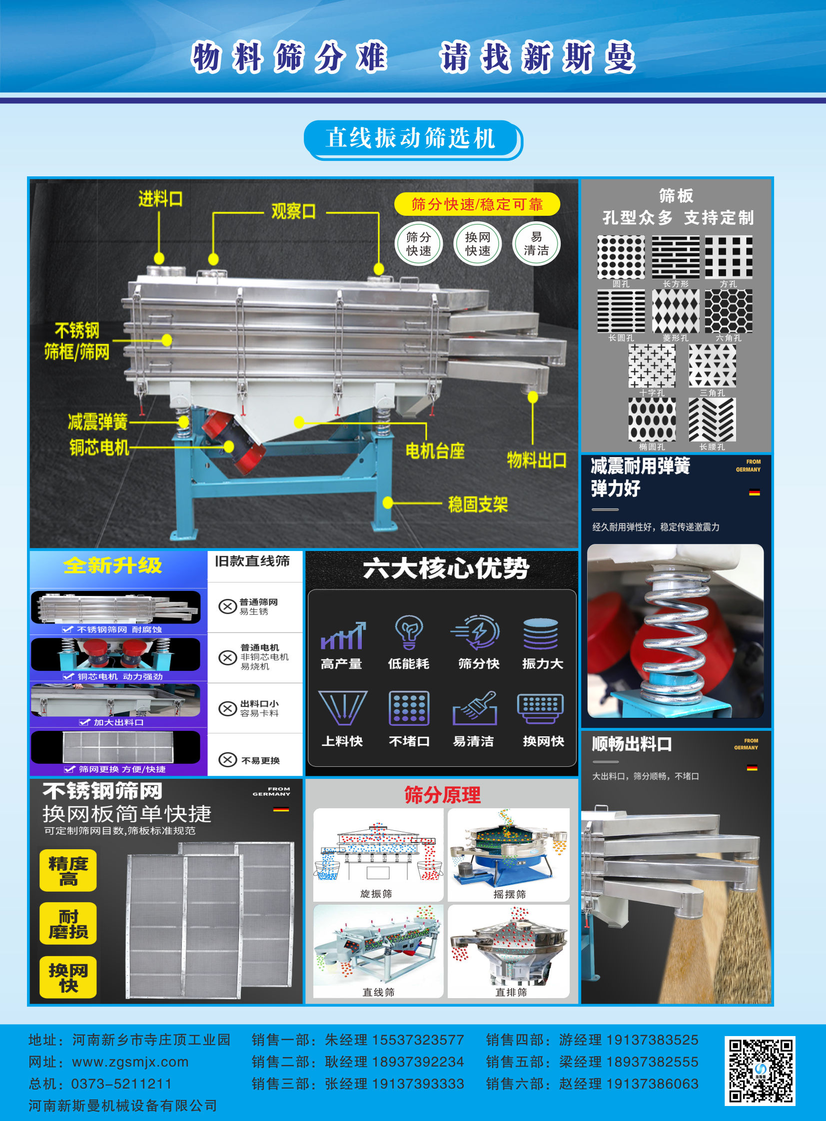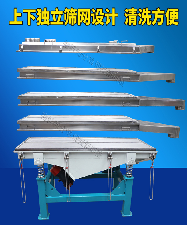 咨詢(xún)熱線:15537323577 多層可拆卸式直線振動(dòng)篩是在原普通直線振動(dòng)篩基礎(chǔ)之上,工藝改進(jìn)優(yōu)化出來(lái)的產(chǎn)品,上下獨(dú)立篩網(wǎng)和網(wǎng)架設(shè)計(jì),清洗方便,多層快速篩選,自動(dòng)排料。具有換網(wǎng)方便、快速拆裝、易清潔清洗、篩分快省時(shí)間、穩(wěn)定可靠,篩分效率高等優(yōu)點(diǎn)。是一種運(yùn)動(dòng)軌跡為直線的中、細(xì)物料篩分設(shè)備,廣泛用于選煤、選礦、電力、制糖、制鹽、化工、磨料、耐材、食品等行業(yè),對(duì)中、細(xì)粒度物料進(jìn)行干、濕式篩分或脫水、脫介、脫泥作業(yè),是高效率篩分的首選產(chǎn)品。