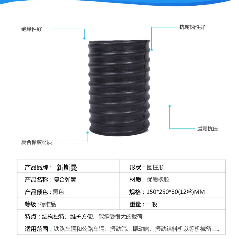 咨詢熱線:15537323577 復合彈簧:是由金屬螺旋彈簧和橡膠復合在一起的園筒狀彈性體。該產(chǎn)品優(yōu)于金屬彈簧,具有抗腐蝕性好、壽命長等優(yōu)點,與其它彈簧相比,減振能力強,緩沖效果好。