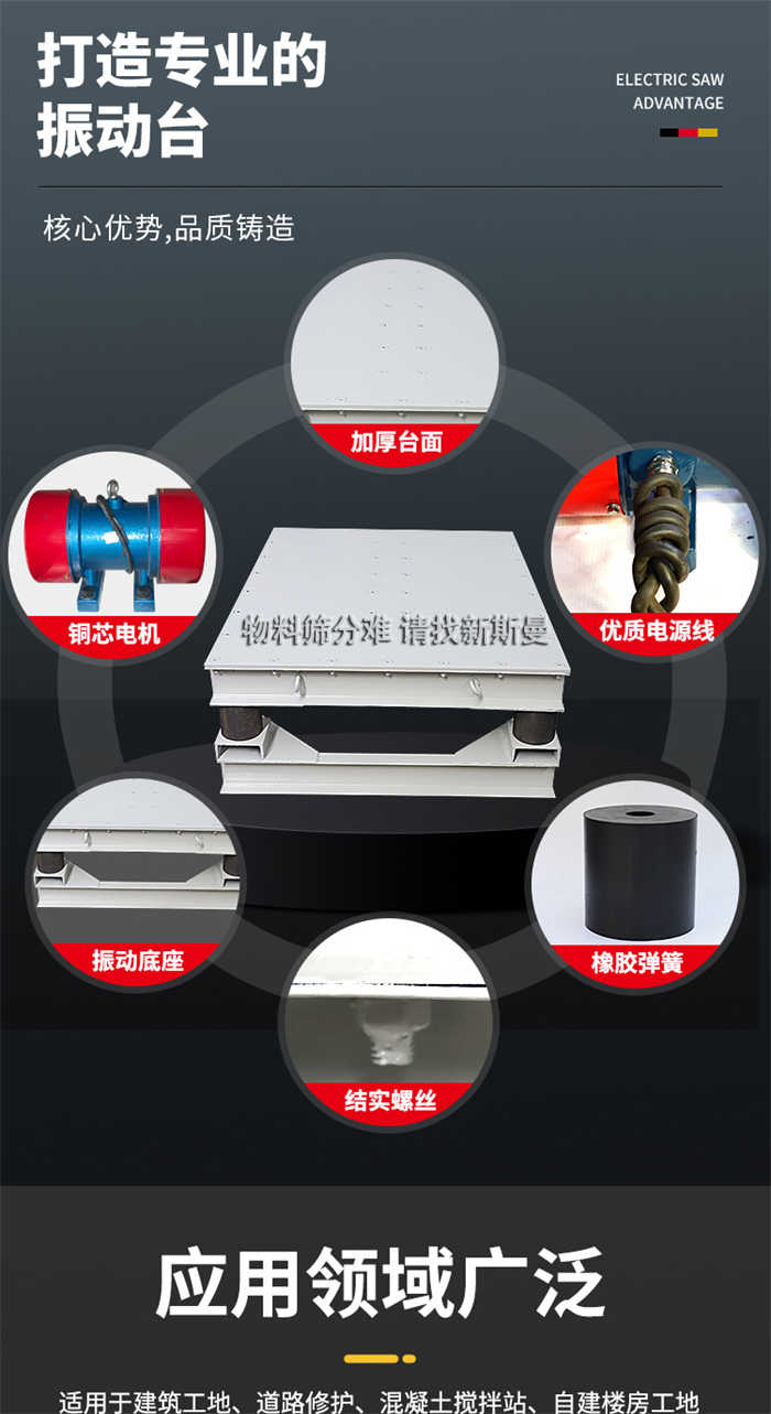 被廣泛應(yīng)用于試驗室、現(xiàn)場工地作試件成型和預(yù)制構(gòu)件震實各種板柱、梁等混凝土構(gòu)件振實成型,并應(yīng)用在冶金、模具、食物、化工、建材等行業(yè)。