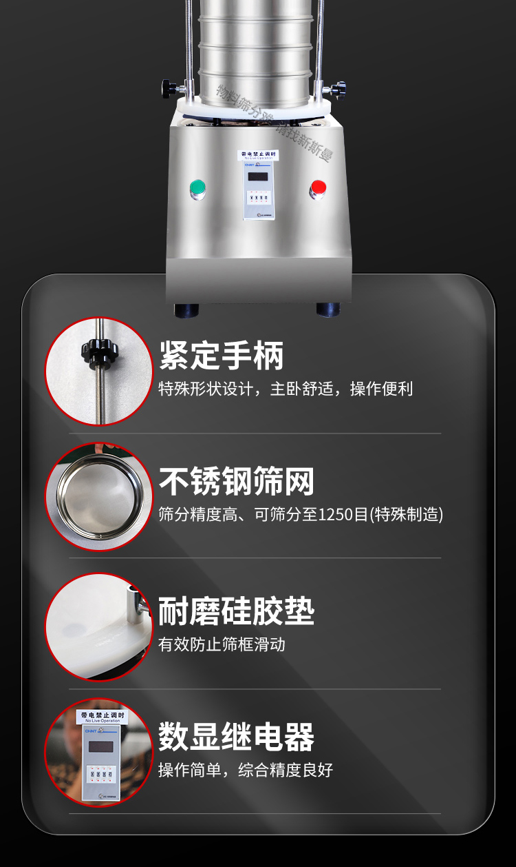 5. 根據(jù)物料性質(zhì)及投料量,在定時(shí)器上設(shè)定運(yùn)行時(shí)間,然后打開電源開關(guān),標(biāo)準(zhǔn)試驗(yàn)篩即開始工作。