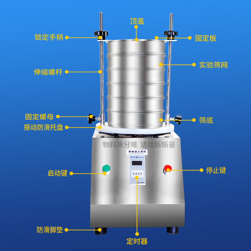5、根據(jù)物料性質(zhì)及投料量,在定時器上設定運行時間,然后打開電源開關,標準試驗篩即開始工作。