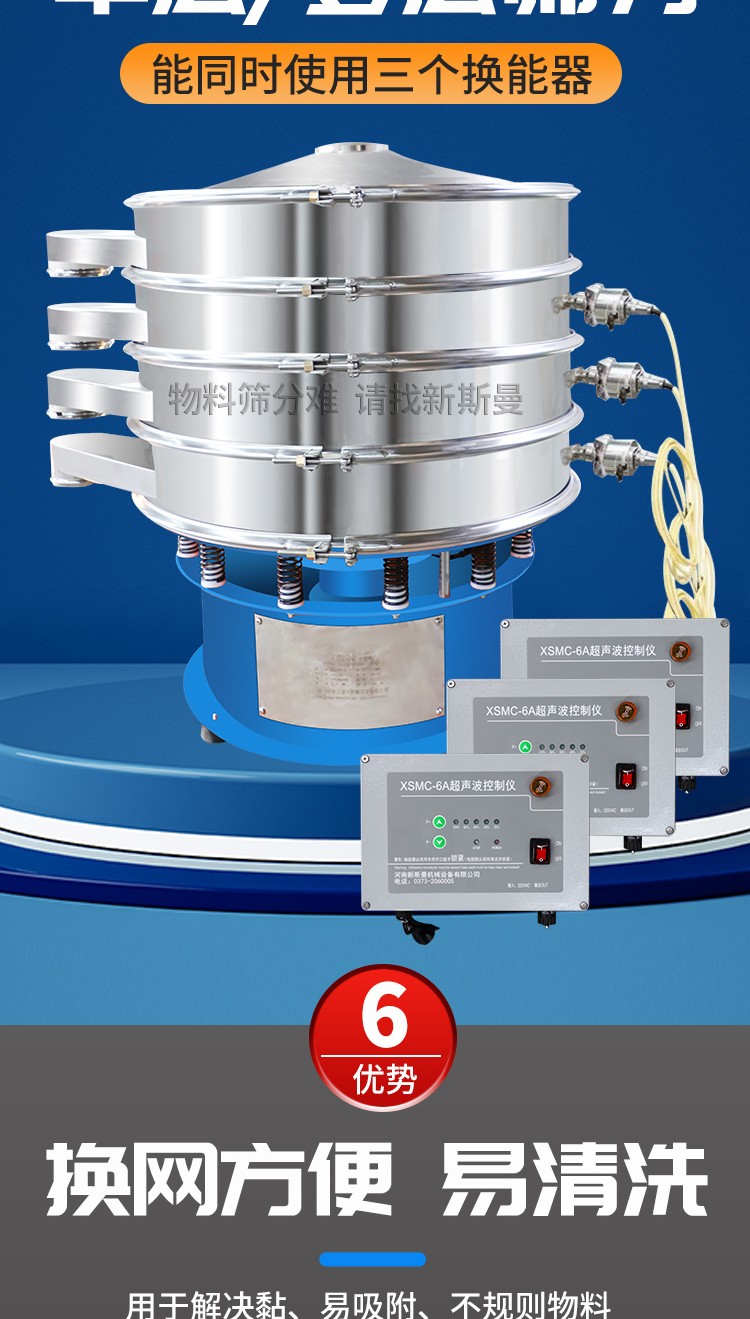 超聲波振動篩是在旋振篩的基礎上引入了超聲波清網(wǎng)裝置,通過將220V、50Hz或110V、60Hz電能轉化為18KHz的高頻電能,輸入超聲換能器,將其變成18KHz機械振動,從而達到高效篩分和迅速清網(wǎng)的目的,使超微細粉篩分成為易事。該系統(tǒng)在傳統(tǒng)的振動篩基礎上在篩網(wǎng)上引入一個低振幅、高頻率的超聲振動波(機械波),以改善超微細粉體的篩分性能。特別適合高附加值精細粉體的用戶使用。超聲波篩分系統(tǒng)是一種簡單實用、可靠的篩分系統(tǒng),是當前網(wǎng)孔堵塞的有效的解決方法??蓮V泛應用于制藥、冶金、化工、選礦、食品等要求精細篩分過濾的行業(yè),篩分過濾精度高,有效解決因團聚、靜電、強吸附性卡堵網(wǎng)孔等篩分難題,是國內篩分行業(yè)的一項重大技術突破。