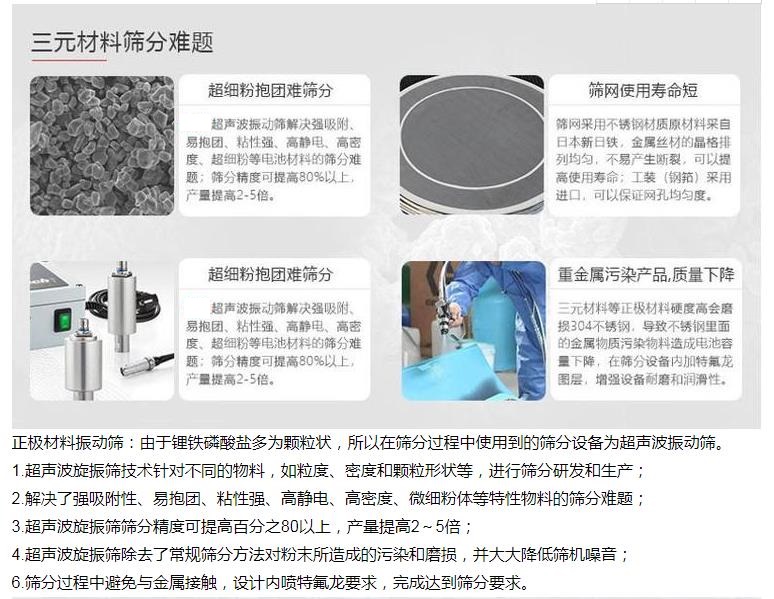 由于超聲波振動在新能源行業(yè)的優(yōu)越表現(xiàn),在線清網(wǎng)效果明顯,對于比較難篩分的物料有其顯著的效果。